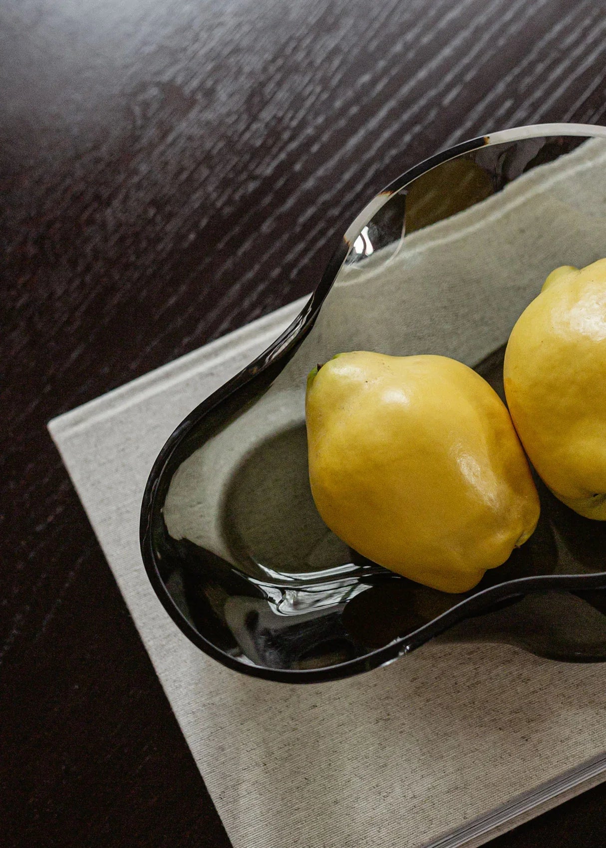Taking its cues from the spiraling movement of air, the undulating Aer Bowl in smoke colored glass brings sculptural appeal to surfaces—whether filled with treats or placed on a surface as a decorative object.