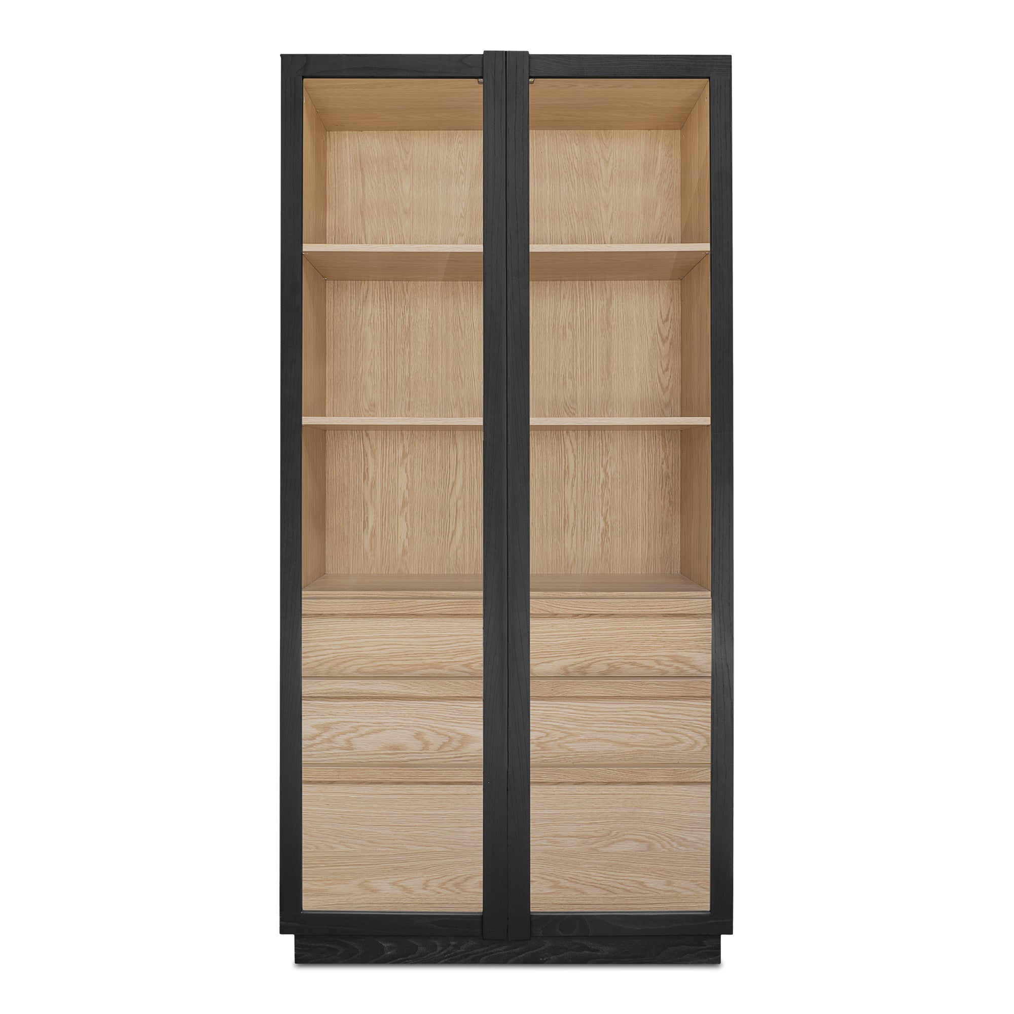 Inspired by the simple elegance of French Cleat handles, the Charlotte tall cabinet features a captivating two-tone design with a sleek black outer frame and natural interior. Tempered glass doors offer a stylish, protective showcase, while three interior drawers neatly store smaller belongings. With its modern and versatile design, this piece balances practical storage with graceful display.