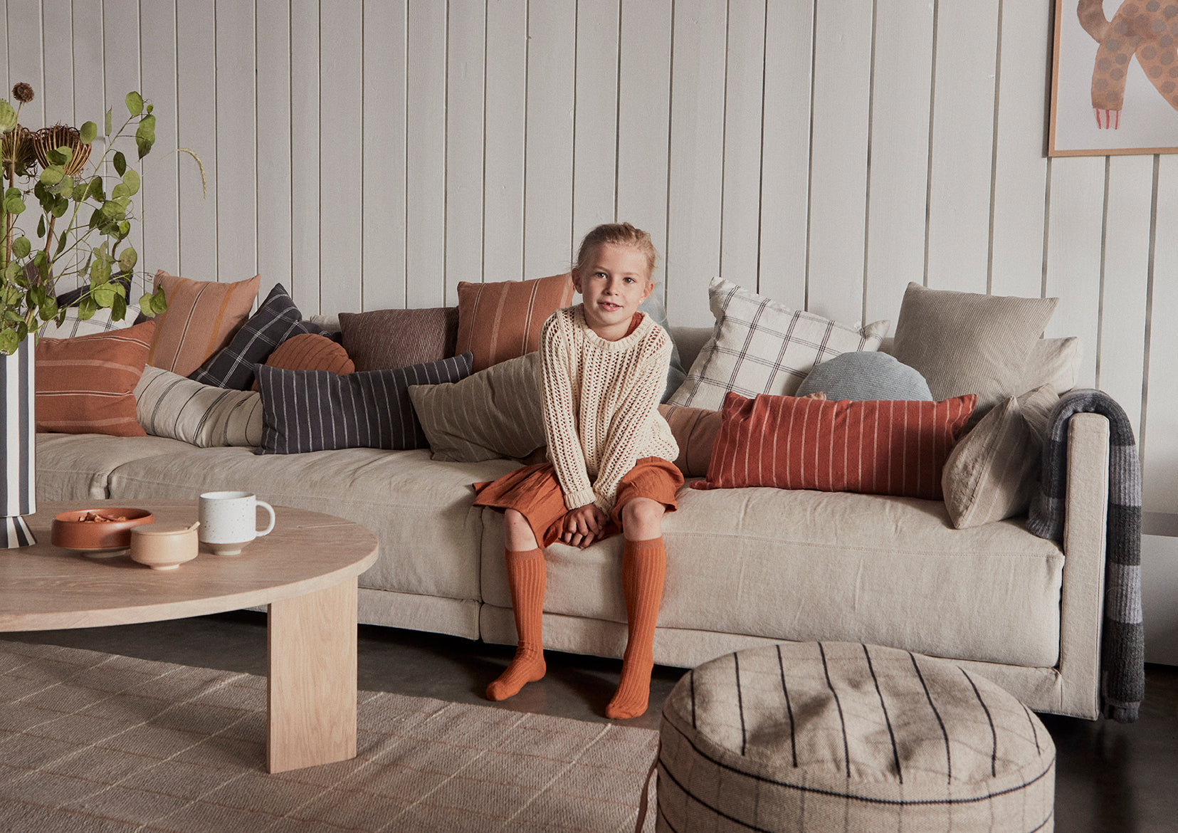 The cushion is woven in organic cotton and is filled with down and feathers. It is recommended to wash the pillowcase on 30° machine wash - wash inside out.