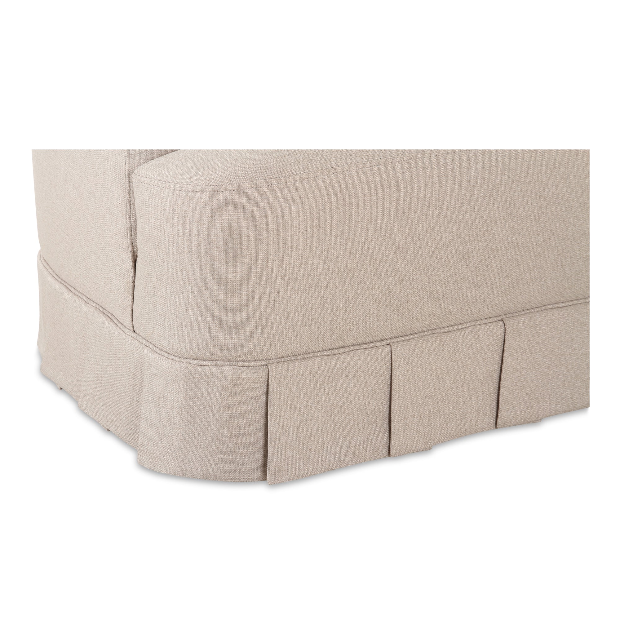 The Maren swivel chair exudes a soft, feminine aesthetic, upholstered in a warm, neutral fabric and featuring a playful yet refined box pleat base reminiscent of vintage finesse, straddling the line between contemporary form and traditional finish. With smoothly rounded corners and graceful, curving forms adding softness to the design, this piece is a study in elegance and subtlety.