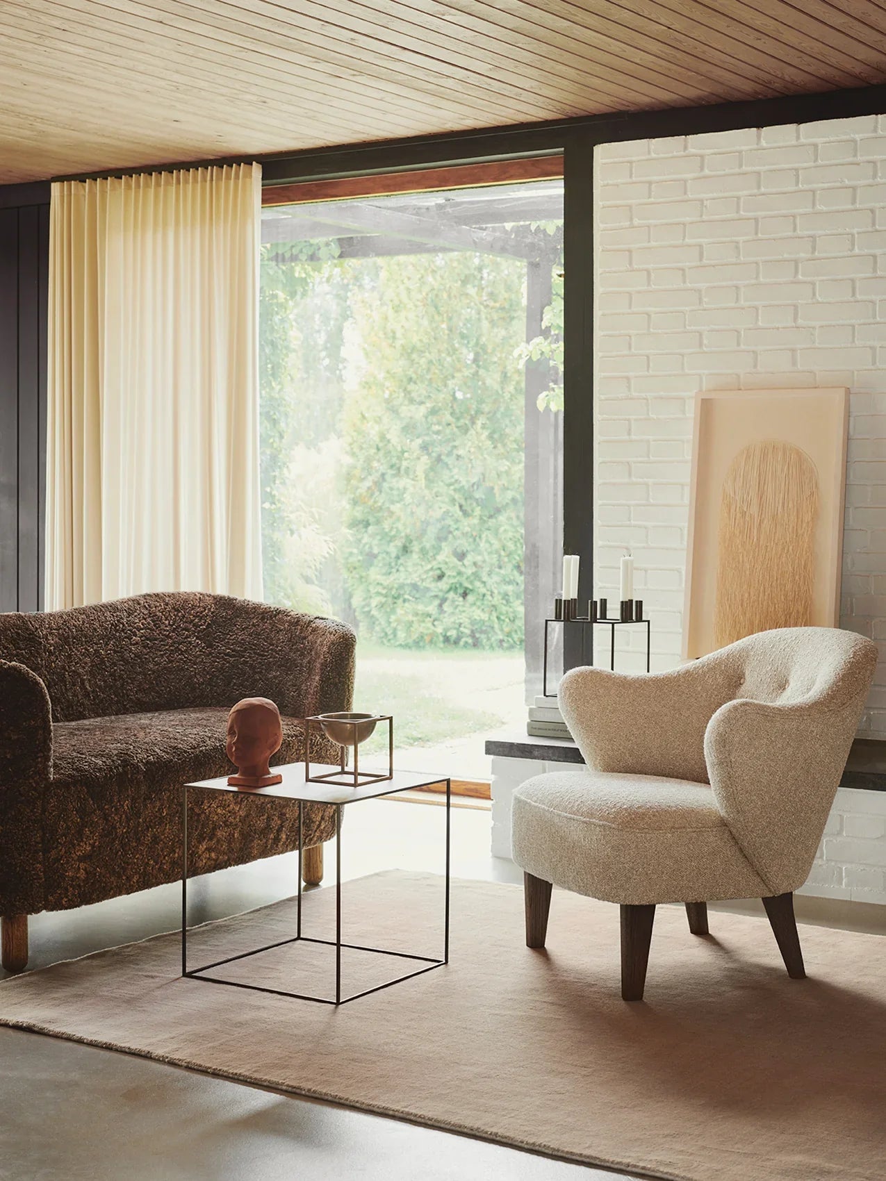 The Mingle sofa was designed in 1935 by architect Flemming Lassen (1902-1984) and was presented at The Copenhagen Cabinetmakers' Guild Competition in the same year. It was subsequently praised for its qualities as a small but elegant sofa in the professional journal "The Architect" Flemming Lassen loved to travel, and he was often inspired by his journeys throughout Europe. He was very taken with both Italy and France, and had a burning desire to tour those countries on his motorcycle. Flemming Lassen wanted to create a sofa made for conversation with a comfort that invited people to stay seated and talk together for long periods of time. The armrests were designed to encircle the sitters, generating intimacy and transforming the sofa into a cozy place to relax. Flemming Lassen took inspiration from both French elegance and modern Italian style, and transferred the trends and his own ideas to a small, upholstered sofa called Mingle.