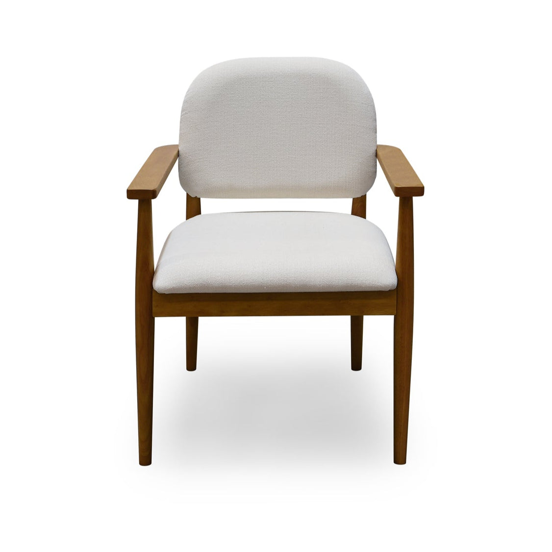 The Norrie dining chair features a continuous frame that flows seamlessly from back to armrests. Crafted from robust rubber wood and upholstered in soft fabric, these chairs exude sophistication as the clean lines make them versatile for various dining settings.
