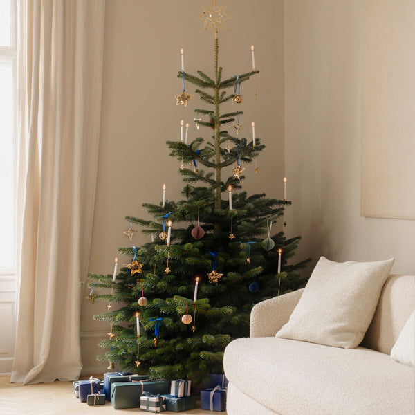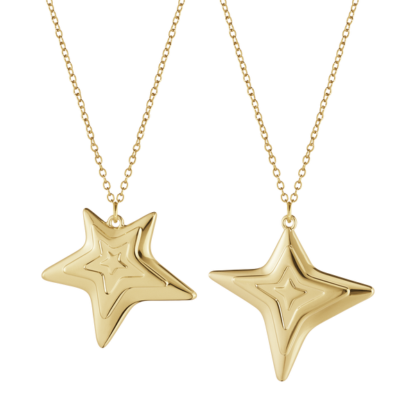 Two gold stars - one with four points and one with five - are transformed into delightful gold plated charms suspended from fine chains and ready to be hung on a Christmas tree or in the window. Inspired by the magic of a crisp and cold winter night’s sky, the decorations are a stylish and contemporary take on a traditional motif.