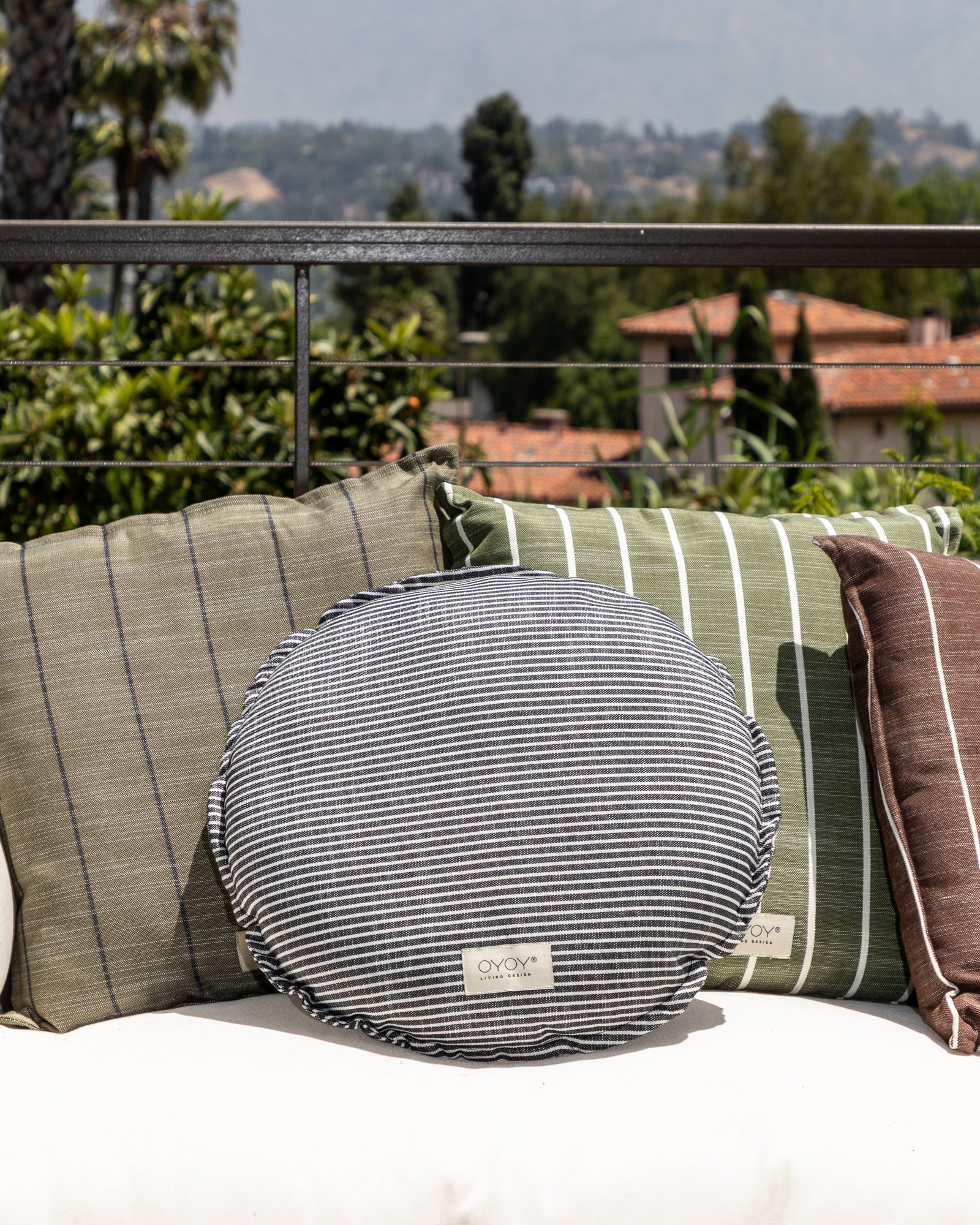 Our Kyoto Outdoor Cushions in recycled polyester are perfect on the terrace or balcony. The round cushion in black/white has a simple and recognizable design with stripes, which creates a cosy and personal expression.