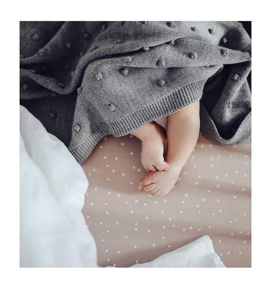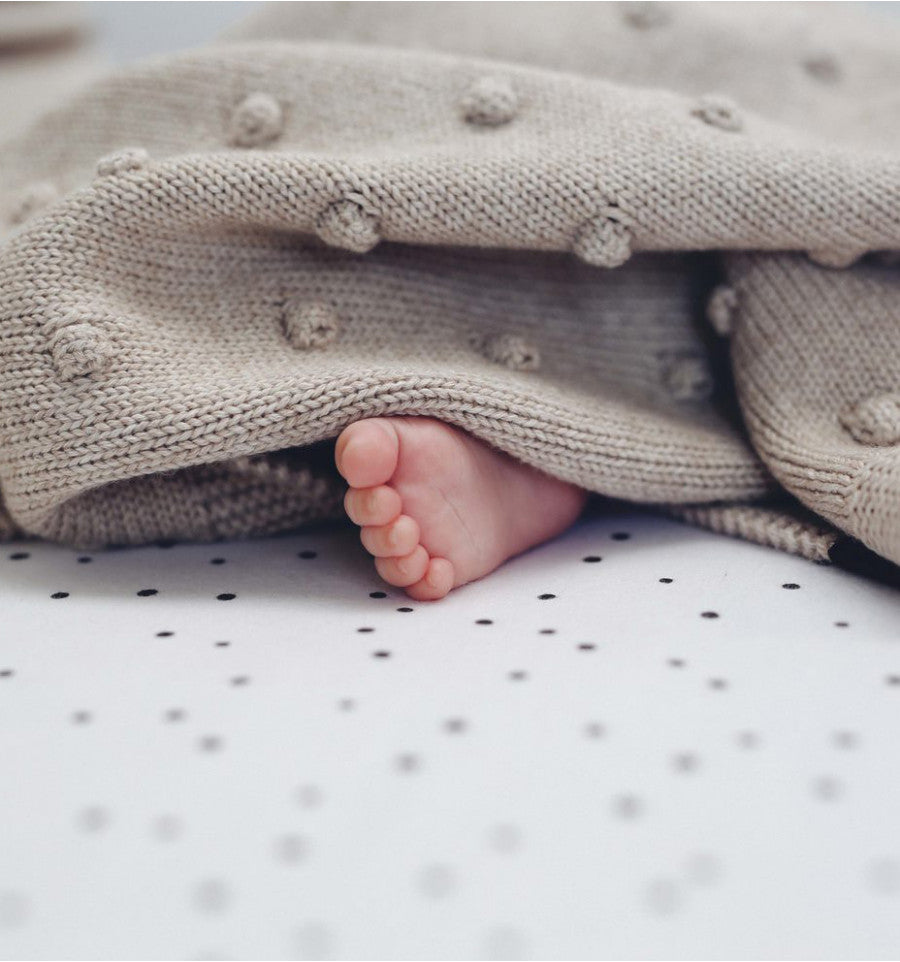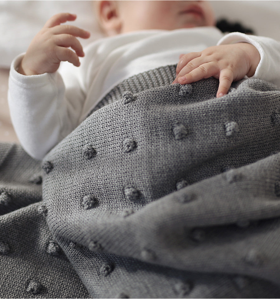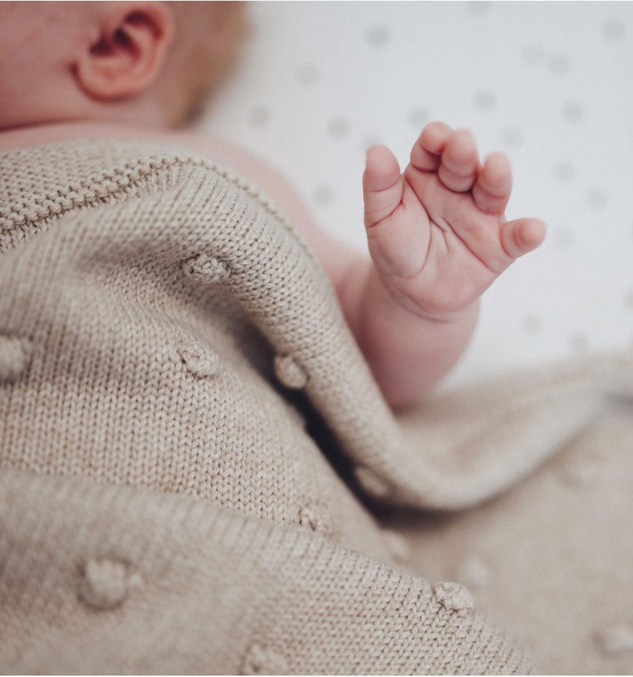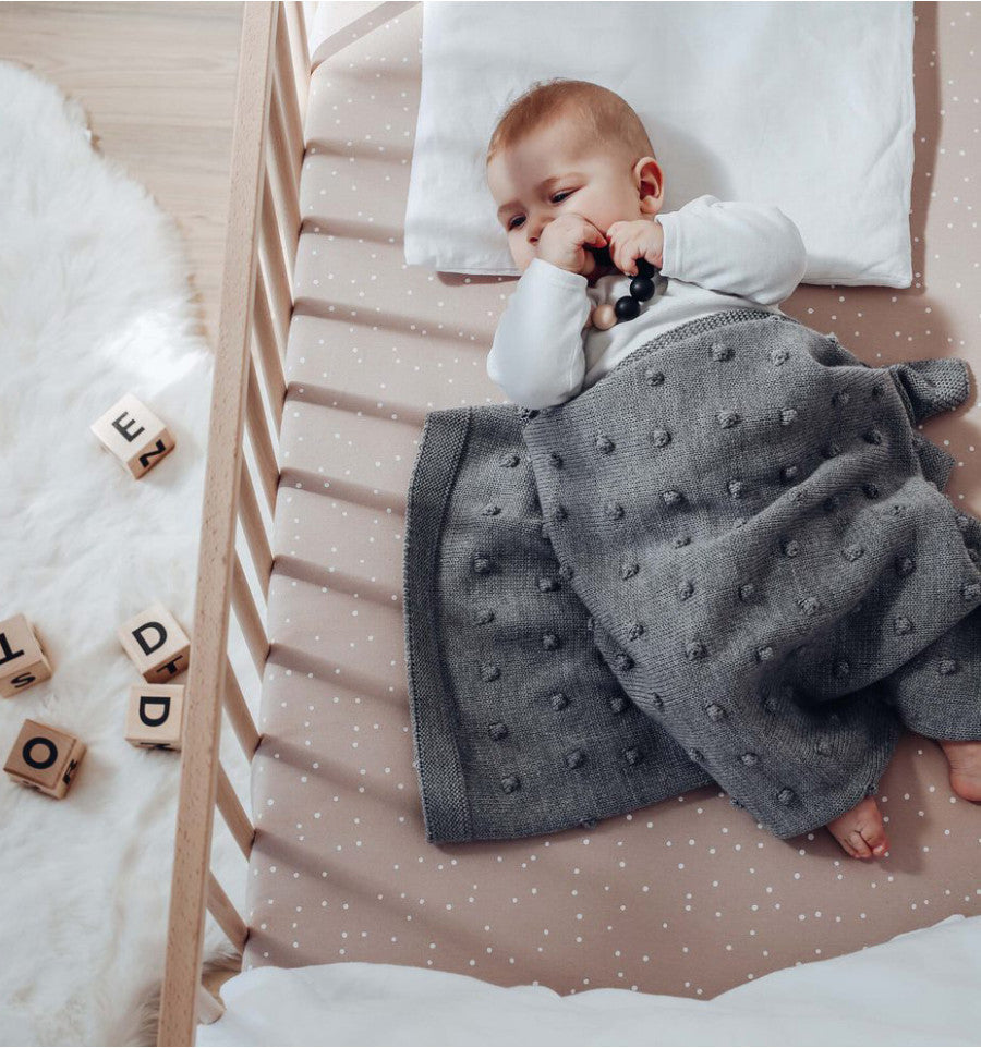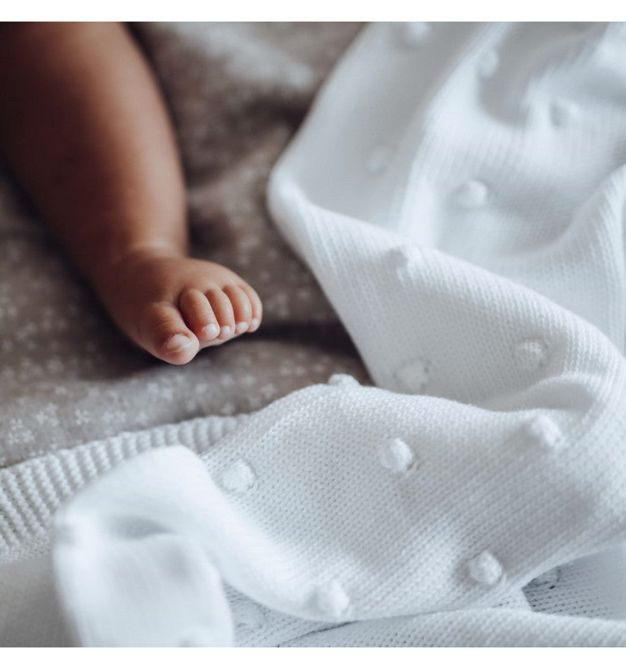 Keep him or her covered in style with this cotton knit blanket adorned with popcorn bobbles. Babies will also appreciate this blanket because its tactile texture will keep their little hands busy, giving them something soft and soothing to snuggle with. Sure to become the favourite for you both.