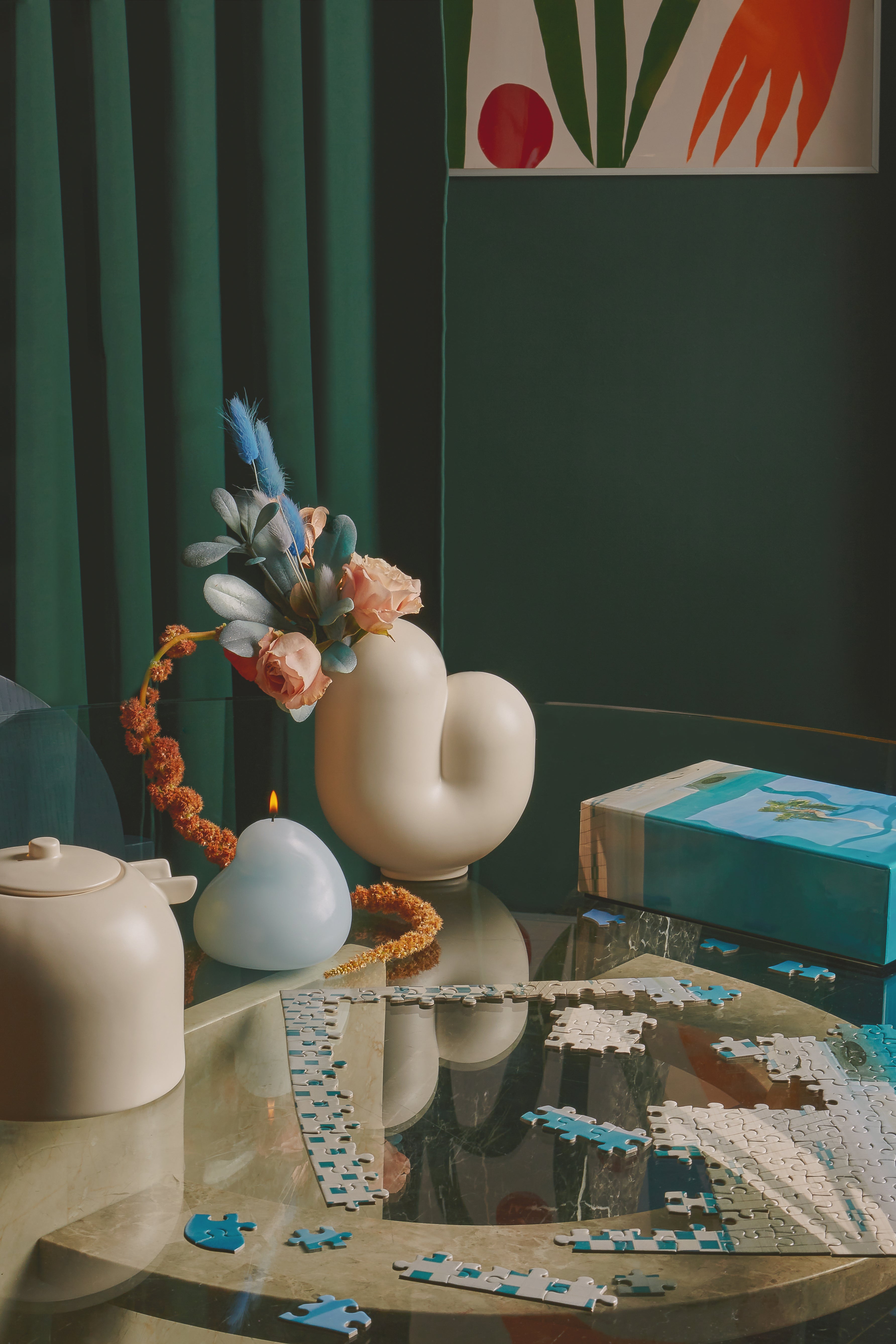 This is a puzzle within a puzzle. These images are translated into a custom puzzle shape to mirror the image within an image, creating two different puzzles that can be completed separately or together.
