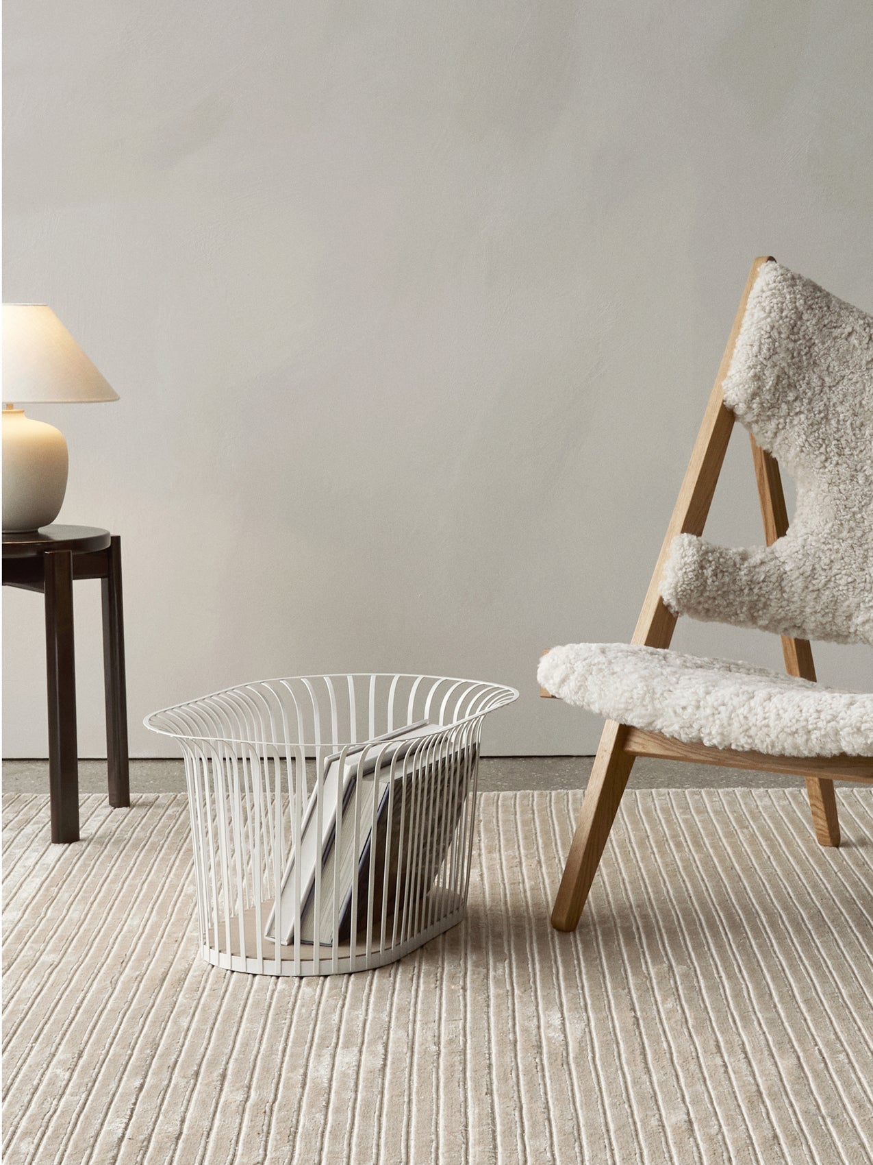 A modern storage solution with a traditionalist feel, the Ribbon Basket contrasts sleek powder coated steel with soft, inviting curves. Crafted with precision, vertically positioned metal strips are formed into a gently rounded lip that makes it easy to carry the basket from room to room. Cushioned on the bottom with tonal leather for an exclusive feel and elevated on silicone feet for stability and protection, it adds instant graphic appeal to a room, as a practical and decorative home for magazines, home textiles, accessories and more.