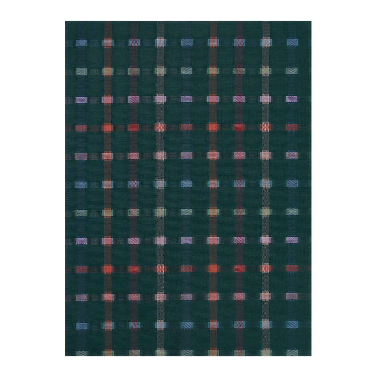 In Sampler, paired rectangles come together, introducing a distinctive weave as they overlap. This dynamic design is inspired by samplers that were used to learn and demonstrate darning: a sewing technique for repairing holes or worn areas in fabric by replicating the structure of the original material. Dating back to at least the 18th century, these samplers typically covered small pieces of cloth in darning "blocks" of various weave structures in a variety of colors—especially blue, green, red, and yellow yarns—to make intricacies visible and show the weaver's skill. Suitable for indoor and outdoor use. Made in the USA with TerraStrand® and Microban®. Backed with flexible, slip-resistant latex and finished with self-bound edges. Free of phthalates.