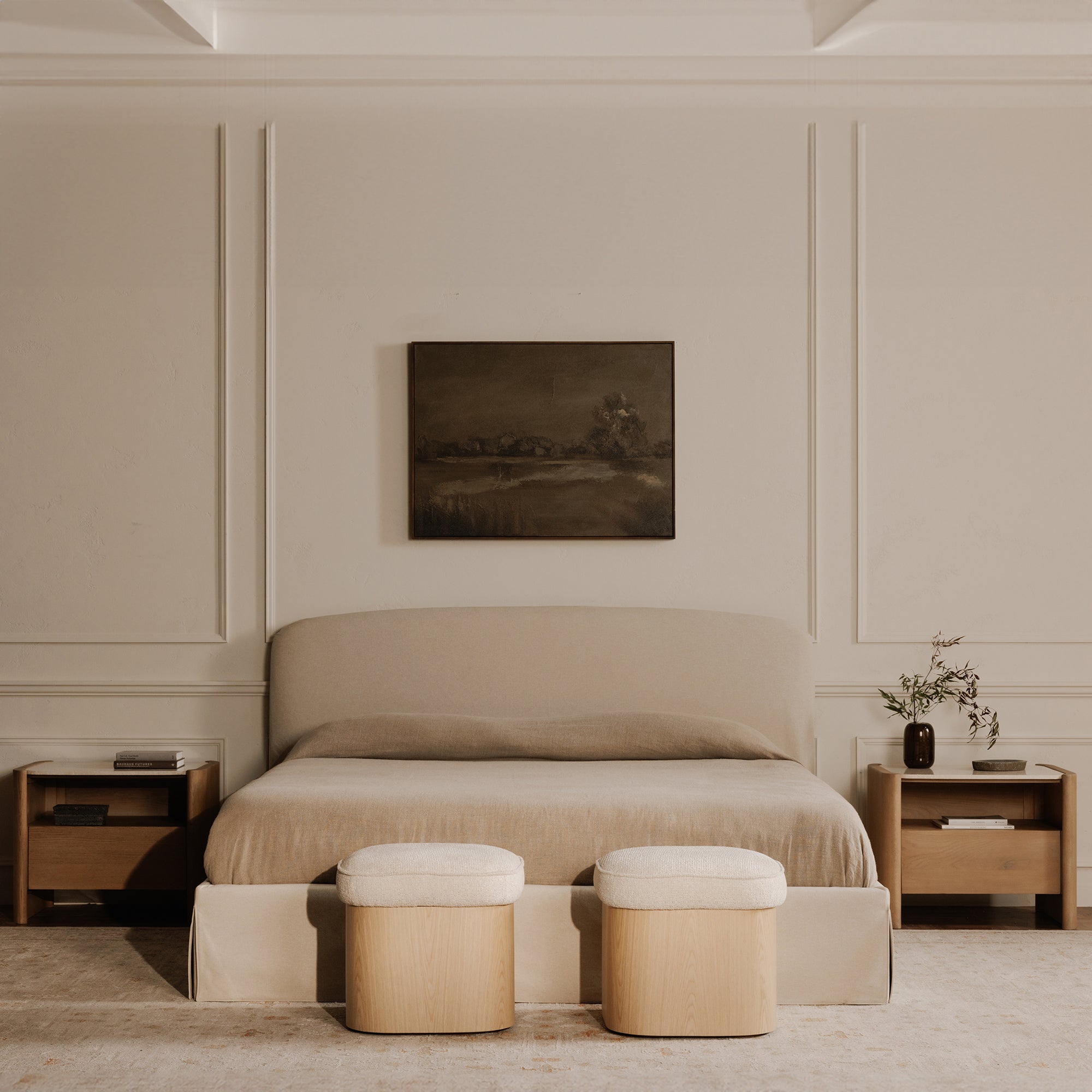 The Sonny stool elegantly articulates the luxury of simplicity with an ash veneer base and a lift top that unveils discreet storage. Upholstered in flecked oatmeal fabric, the plush seat contrasts the wood's solid nature with piping that traces its contours. Curved corners soften the stool's silhouette, creating a serene yet functional piece.