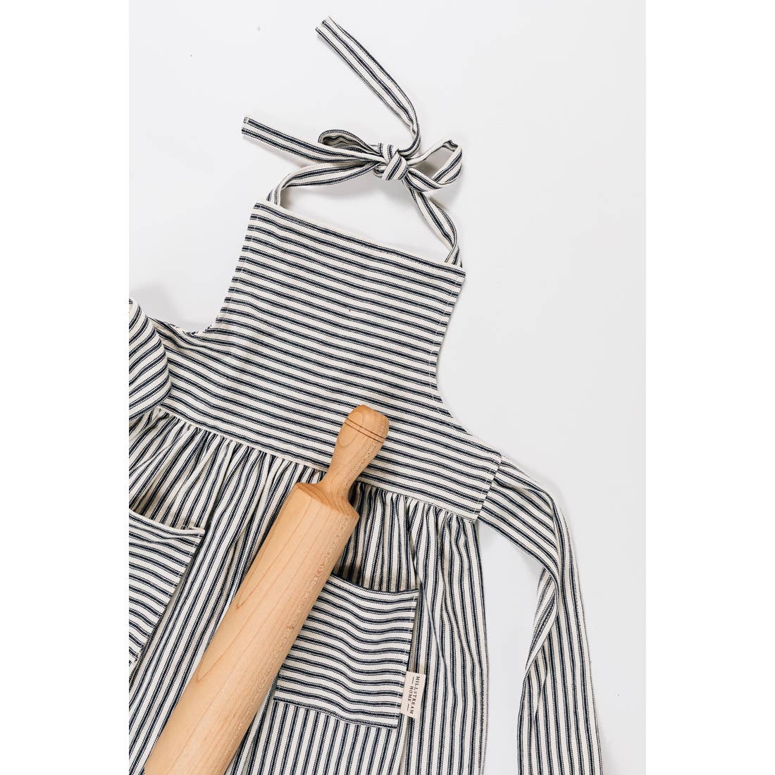 Our aprons are inspired by our years in the kitchen next to our mother. Each one is meticulously handmade using durable 100% pre-shrunk cotton ticking fabric. Our blue and white ticking is woven, not printed.