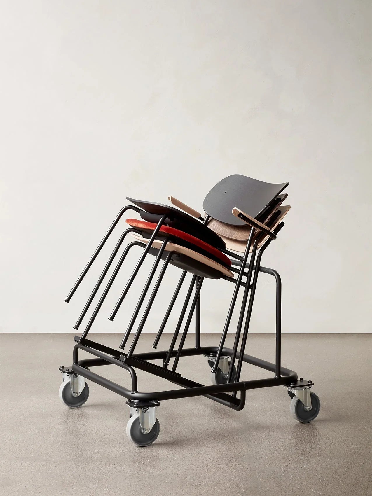 Efficiently transporting and storing between 15 to 20 Co or Ready Dining Chairs, this durable powder-coated steel trolley is fitted with swivel casters that rotate 360 degrees for ease of use and direction of movement. Use the break to lock the wheels securely when storing chairs statically.