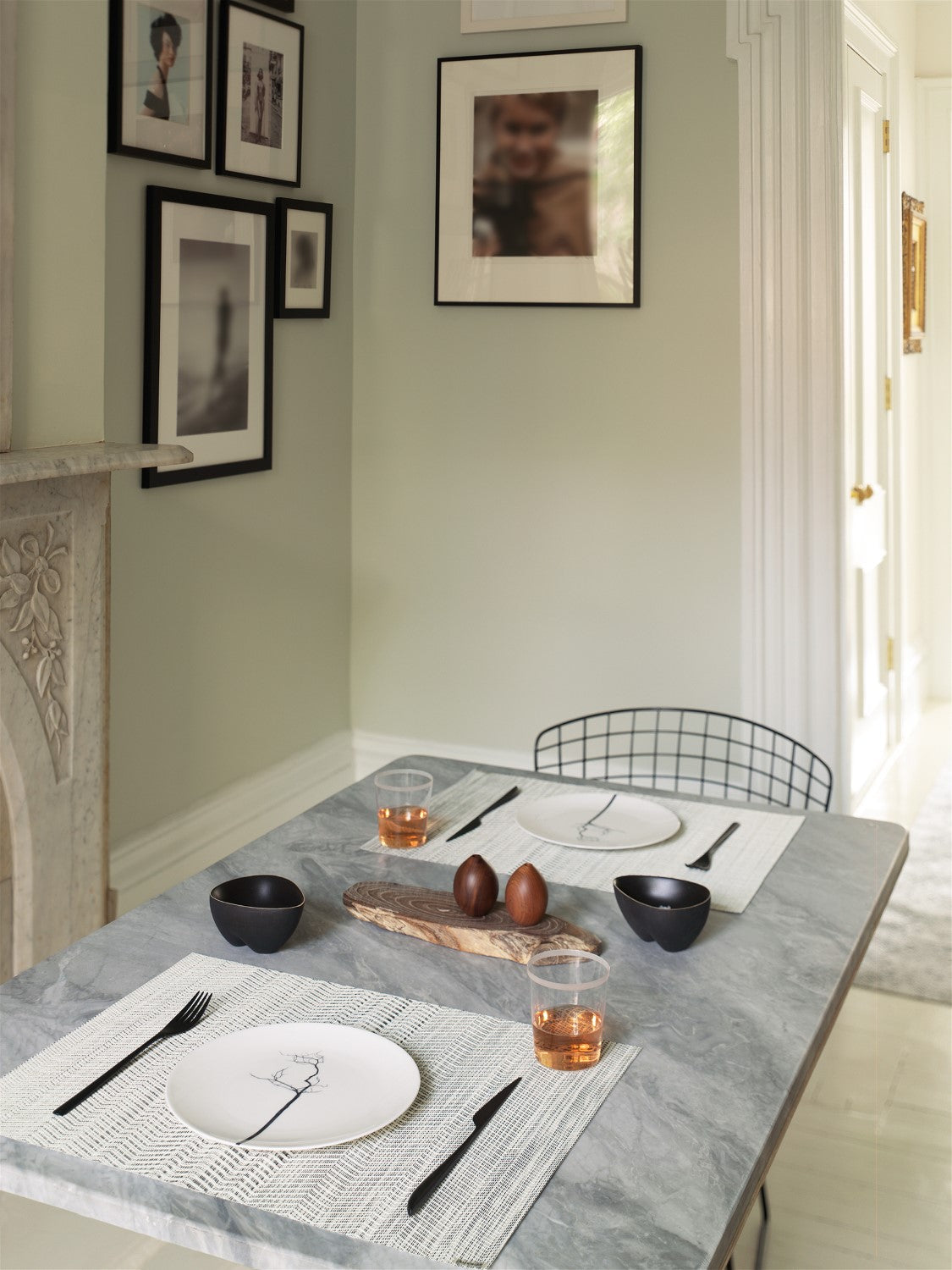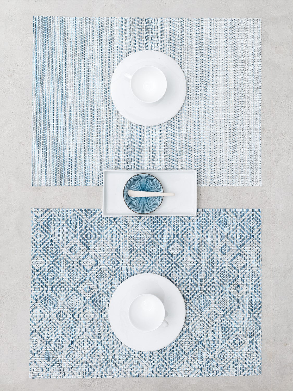 Based on a traditional twill construction, Wave achieves its striking ombré effect by gradually shifting weaves. Our signature bi-color extruded yarns are woven in such a unique way that the color seems to appear and disappear, breaking up the undulating lines. Wave is available in Blue and Grey, both woven with off-white yarns, and in White/Black. Suitable for indoor and outdoor use. Made in the USA with TerraStrand® and Microban®. Free of phthalates.